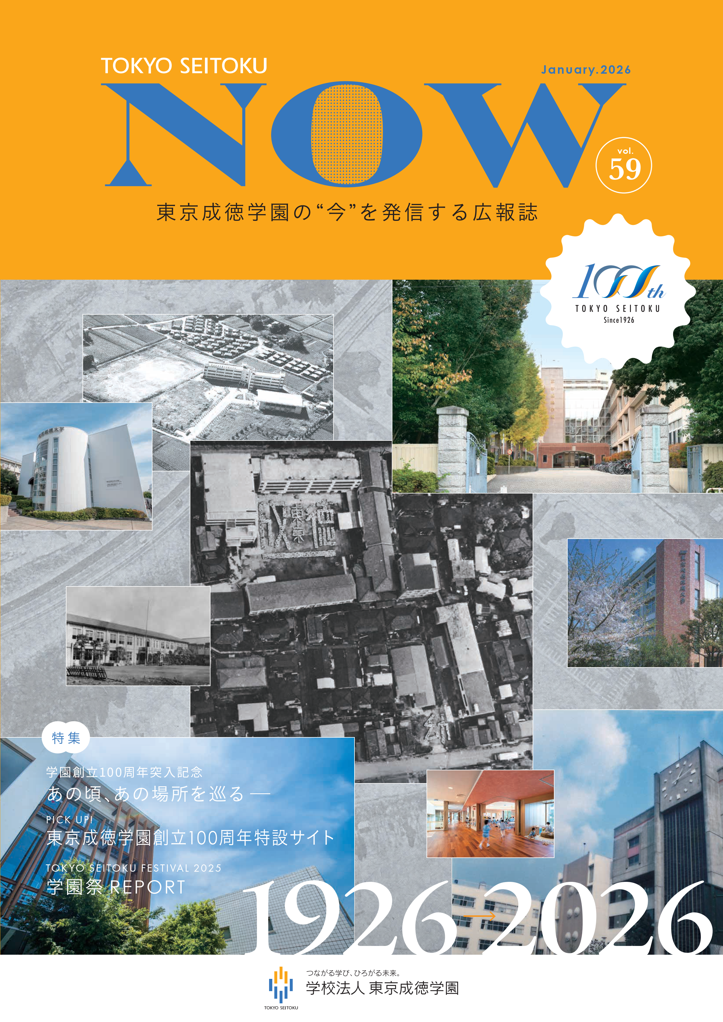 学園広報誌『TOKYO SEITOKU NOW』Vol.59を2026年1月に発行しました。今号では、2026年の学園創立100周年突入記念「あの頃、あの場所を巡る!TOKYO SEITOKU 1926-2026」として、学園の軌跡を懐かしい写真とともにたどる特集企画を掲載。東京成徳100年の歴史を今昔写真で振り返ります。