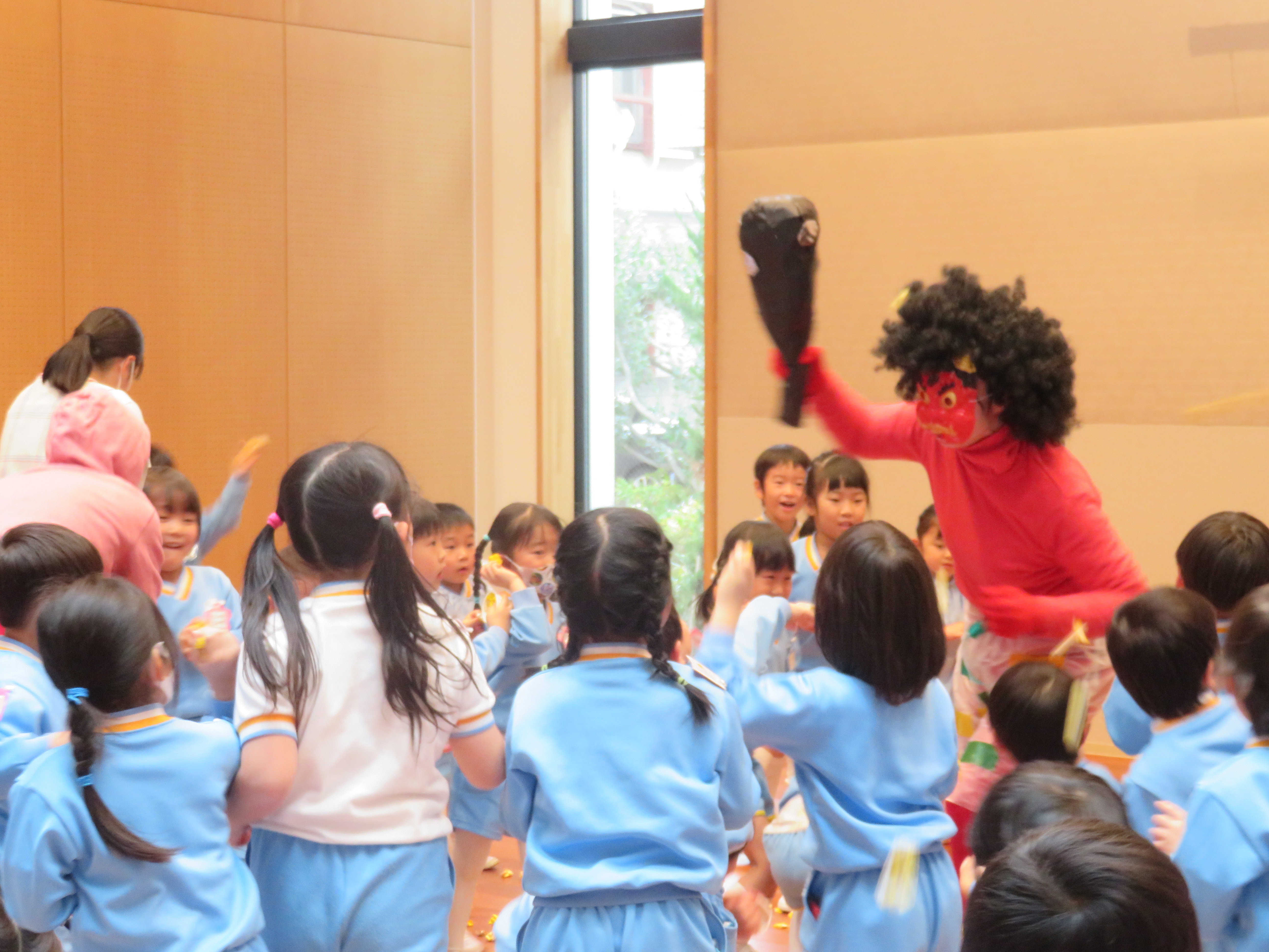 勇敢に豆を投げる子もいれば、怖くて先生の後ろに隠れる子も……😮