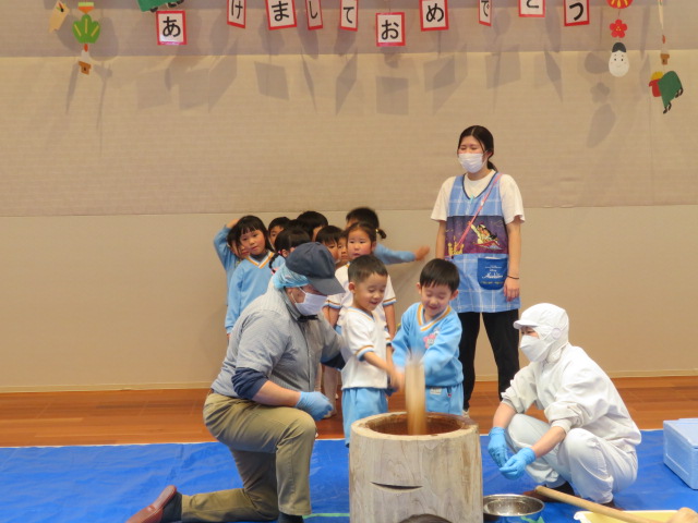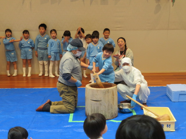 いよいよお餅をつきます❕年少さん、年中さんは2人ずつ、年長さんは1人で一生懸命お餅をつきました👏