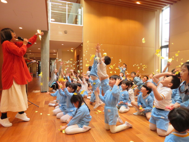 音楽に合わせて、紙を使って音を出したり、ちぎった紙を上に投げたりして楽しみました🎉