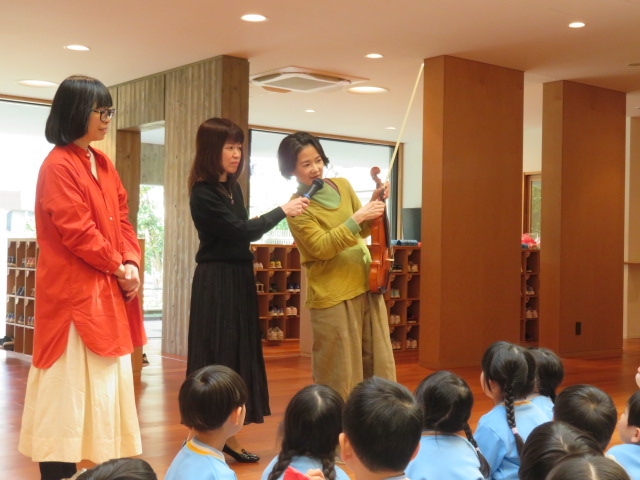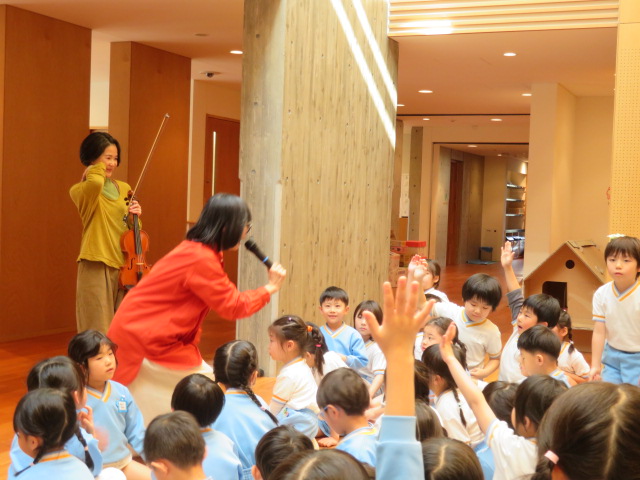 「バイオリンの弓は何で出来ているんですか?」「なんで音がでるんですか?」など子ども達は興味津々👀