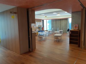 各保育室の扉は収納可能な引き戸になっていて、開け放つことで隣の保育室や廊下と一体となった空間としても活用できるようになります。