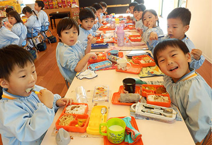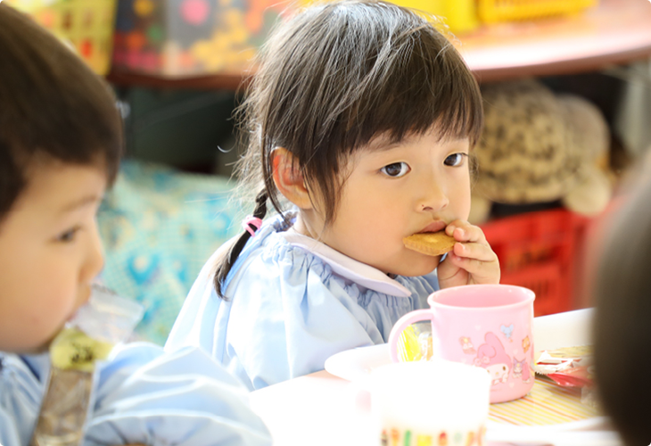 本園では、土曜日を除く毎日、給食をお出ししています。みんなで同じ、栄養バランスを考えたおいしくヘルシーなお昼の食事では、食事のマナーや正しい食習慣なども自然に身につくよう指導しています。